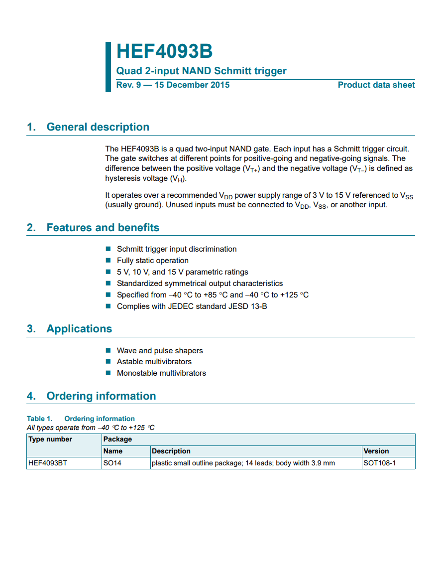 HEF4093BT,653 SOIC-14- Four-channel 2-input NAND Gate Schmitt Trigger – Original genuine product